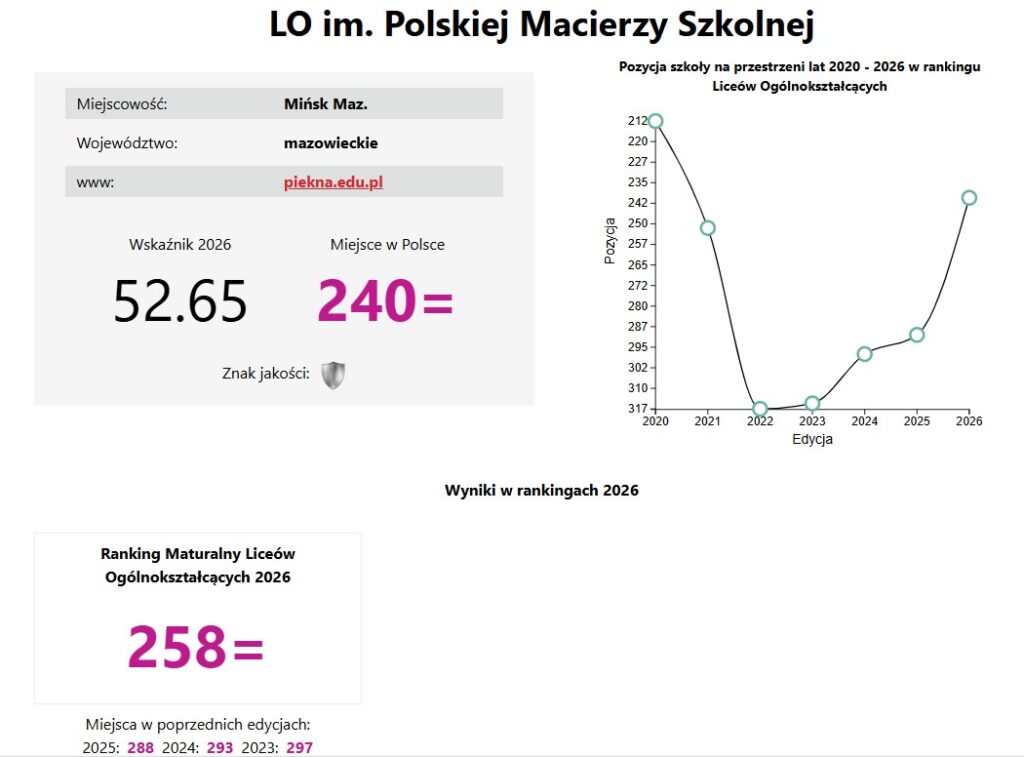 Miejsce w rankingu może być wskaźnikiem dla uczniów i rodziców stojących przed wyborem szkoły ponadpodstawowej. Szczególnie cieszy nas utrzymywany przez ostatnie lata wzrost, który świadczy, że nasi uczniowie przy wsparciu nauczycieli i rodziców rozwijają się, osiągając coraz wyższe wyniki edukacyjne. Postaramy się utrzymać kurs w przyszłości!