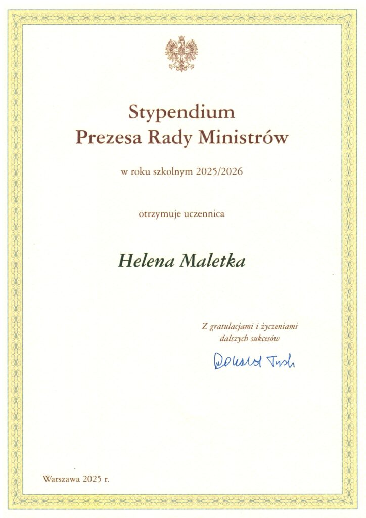 Z dumą informujemy, że Helena Maletka, uczennica klasy 2C (profil matematyczno-biologiczno-chemiczny) otrzymała stypendium Prezesa Rady Ministrów za wybitne osiągnięcia edukacyjne. Gratulujemy serdecznie Helenie oraz Jej Rodzicom. Warto dodać, że Helena, wykorzystując swoje liczne talenty, angażuje się również w działania społeczne i artystyczne. Dołączamy do słów Pana Premiera i życzymy Helenie dalszych sukcesów. Cieszymy się, że możemy towarzyszyć i wspierać naszych uczniów we wszechstronnym rozwoju.