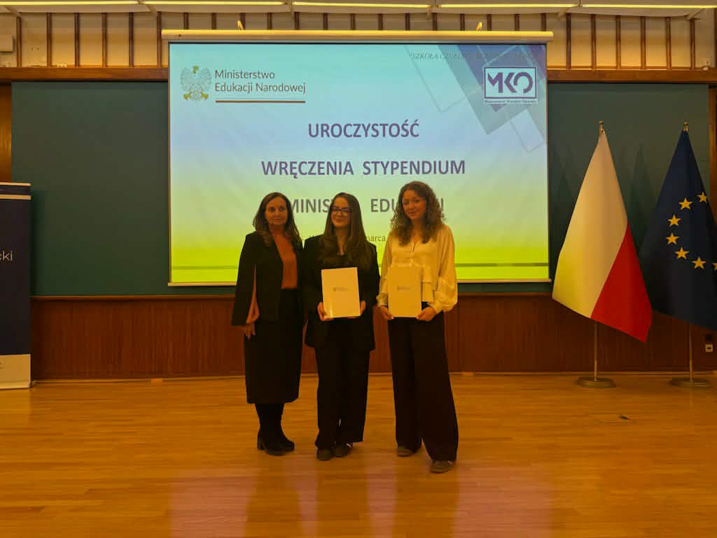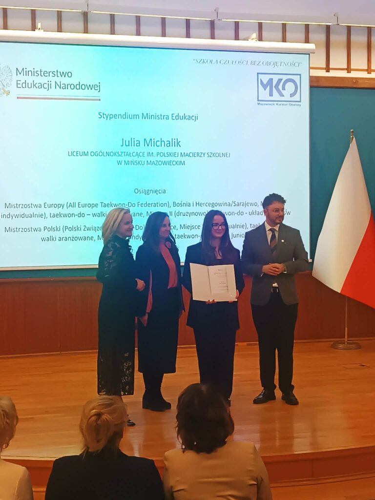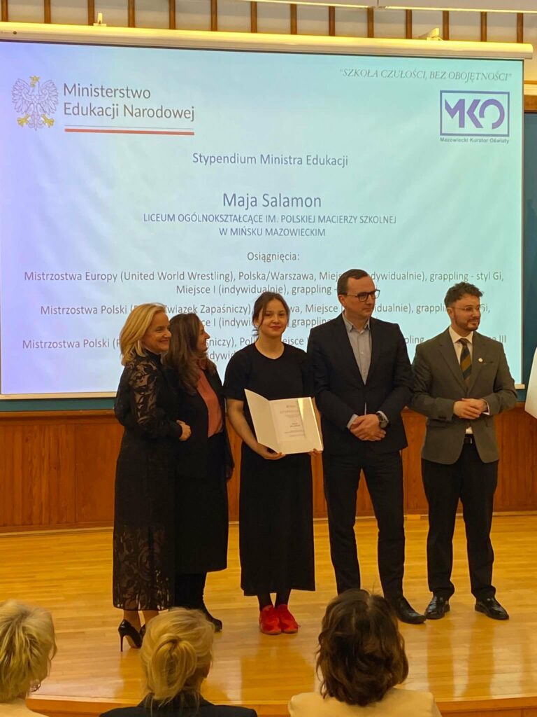 W auli Szkoły Głównej Handlowej w Warszawie odbyło się wręczenie stypendiów Ministra Edukacji dla uczniów szkół ponadpodstawowych. Nasze uczennice Wiktoria Szczepańska i Julia Michalik oraz absolwentka Maja Salamon odebrały z rąk Mazowieckiego Kuratora Oświaty pani Wioletty Krzyżanowskiej te szczególne wyróżnienia. Dziewczęta nie tylko osiągają wysokie wyniki edukacyjne, ale także sportowe na ogólnopolskim i międzynarodowym poziomie. W tym uroczystym wydarzeniu dziewczętom towarzyszyła pani dyrektor Beata Chromińska.